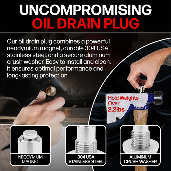 Also, neodymium magnets are one of the strongest magnets available on the planet, and we use one of the strongest-grade versions available. Our plug's magnet has the strength to hold weights over 2.2 lbs! This empowers our plug with enormous strength to effectively pull unwanted metals out of your motor oil, resulting in longer engine life. Loose metal debris in your engine oil will slowly cause wear on the internals of your engine. Our magnet will extract the small metal particles that are too fine for oil filters to catch. Oil filters are designed to catch particles larger than 35 microns. It will also capture larger metal shavings that plug oil filters.