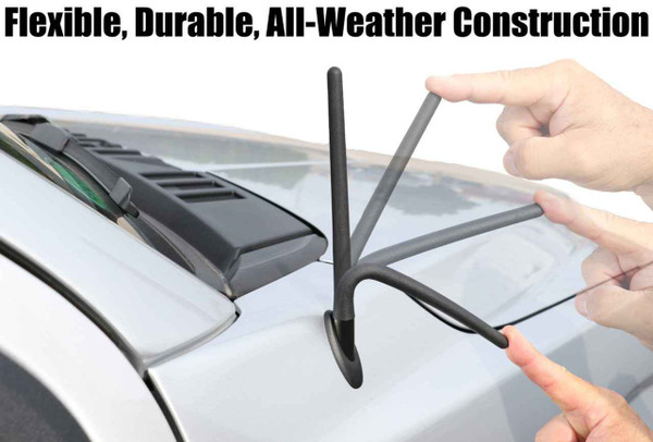 The mast itself is constructed of durable stiff rubber that exhibits flexibility yet will not bend over at speed. Through years of testing, our rubber compound has shown extreme durability in all conditions. It has a slightly textured look, and is 6 3/4" tall. This mast is a direct replacement “screw-on” mast and is specific for your vehicle.
